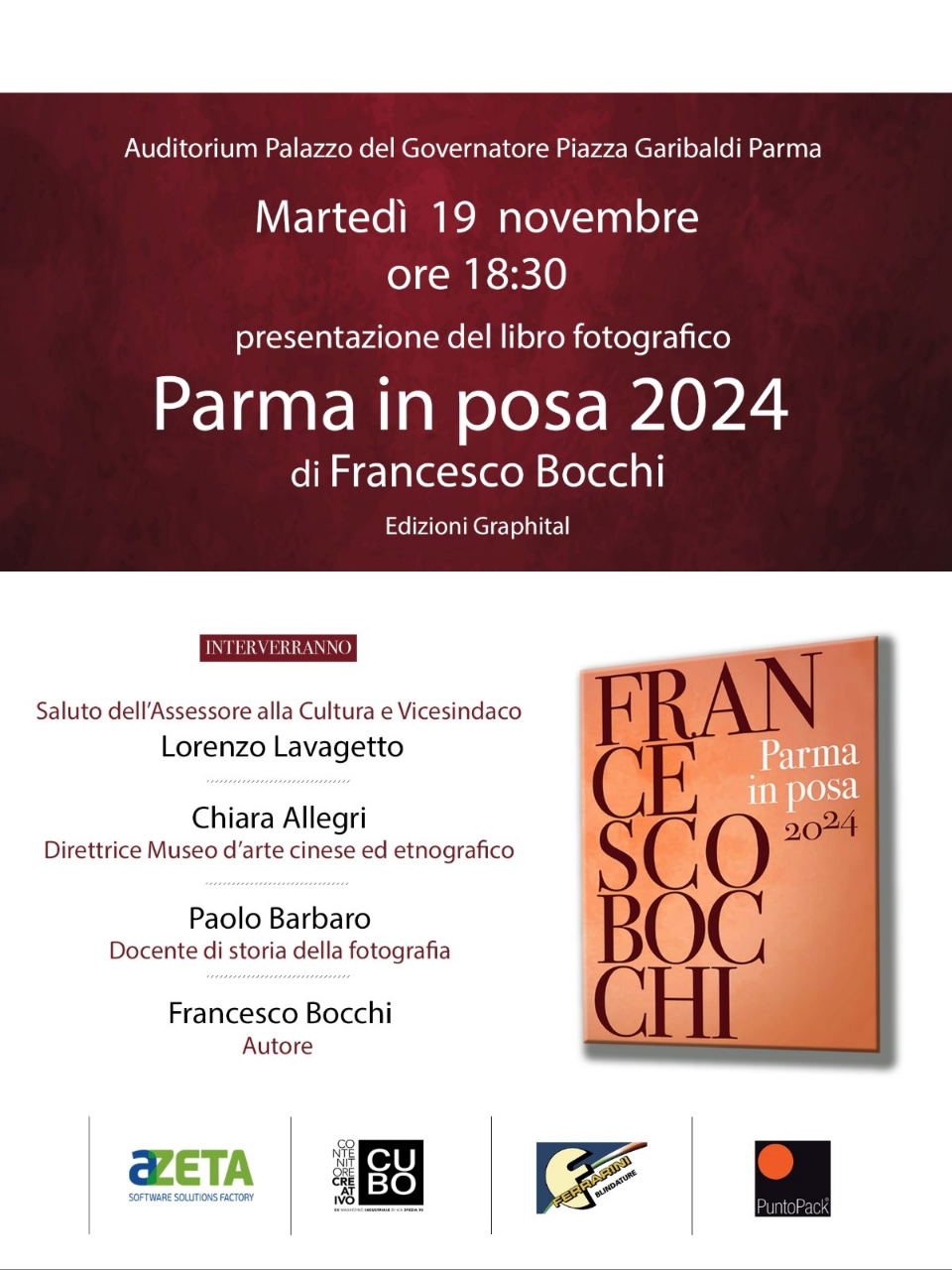 Il 19 novembre 2024, alle ore 18:30, l’Auditorium del Palazzo del Governatore a Parma ospiterà un evento imperdibile per tutti gli amanti della fotografia, della cultura e della città stessa: la presentazione del libro "Parma in posa 2024" di Francesco Bocchi, edito da Graphital.