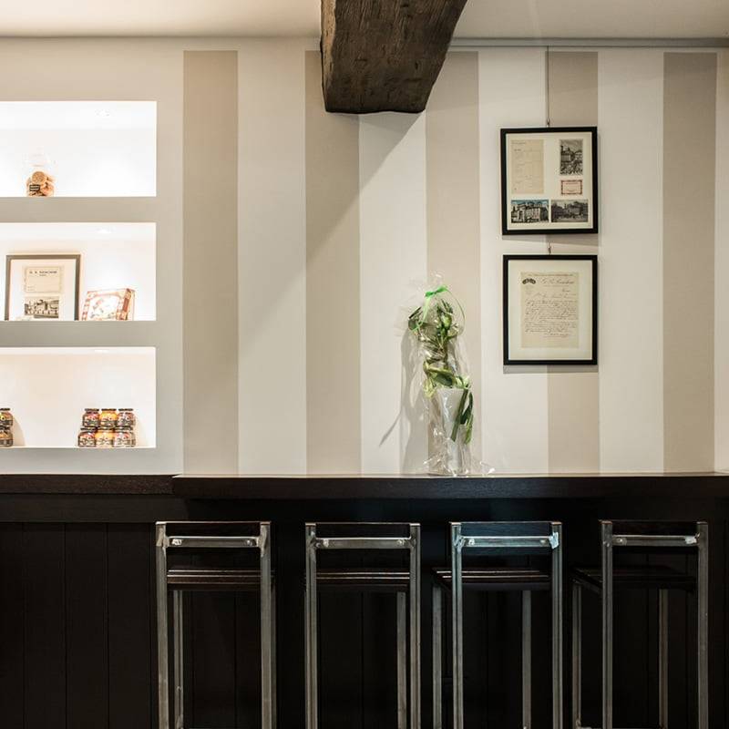 Carta da parati a righe sulle pareti, grandi travi di legno sul soffitto, in realtà in eps, e un bancone che occupa l’intera larghezza del negozio sono gli elementi che caratterizzano la realizzazione.