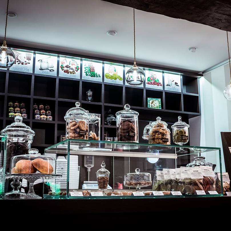 L’attenzione al dettaglio è visibile nella lavorazione del banco bar e nella parete retrostante, fatte a mano, come tutte le indicazioni dei prodotti.