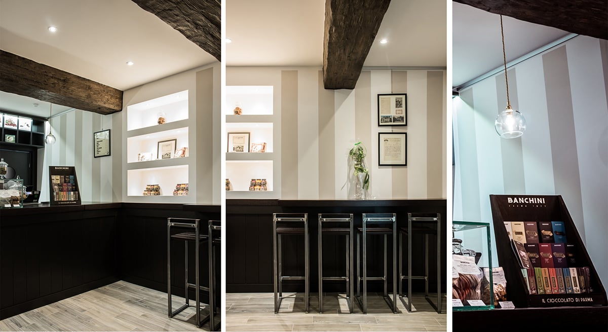 Carta da parati a righe sulle pareti, grandi travi di legno sul soffitto, in realtà in eps, e un bancone che occupa l’intera larghezza del negozio sono gli elementi che caratterizzano la realizzazione.