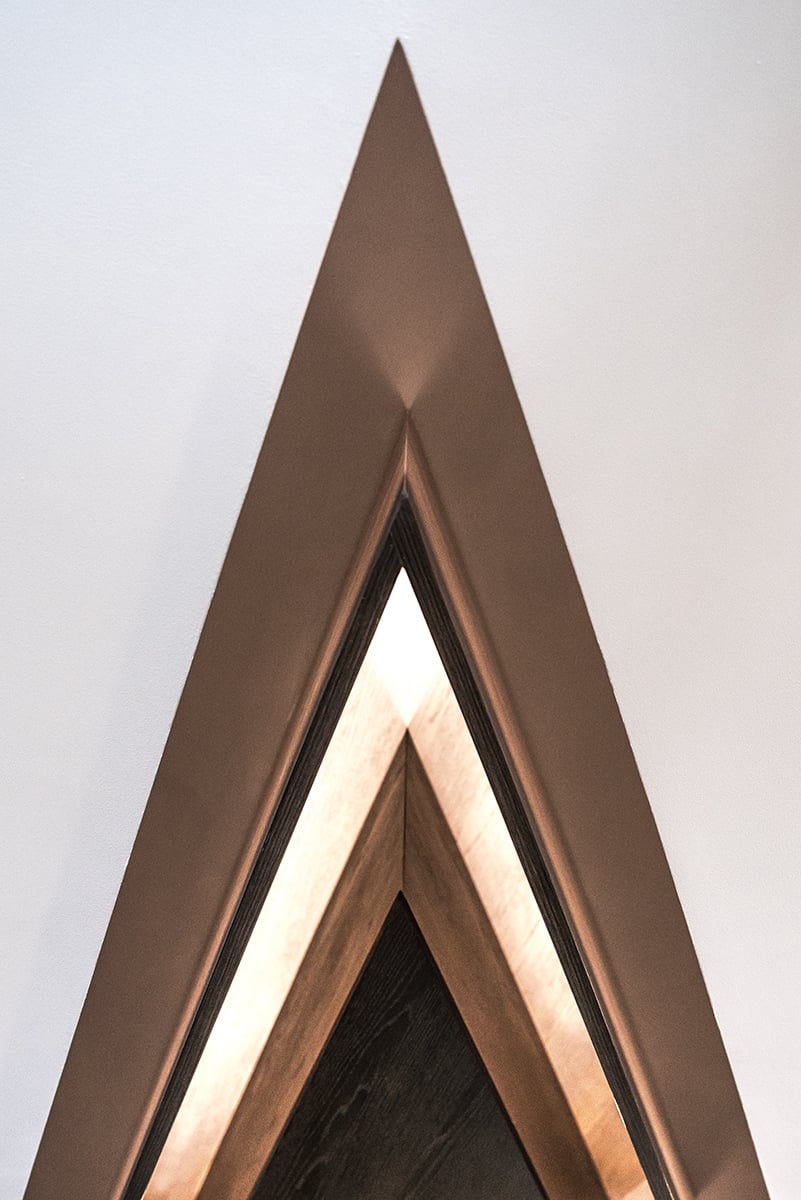 Il risultato vede completamente rivalutato un fabbricato commerciale degli anni ’50 attraverso l’uso di materiali e forme contemporanee che dialogano con gli elementi di arredo progettati su misura. L’elemento più caratteristico dell’intervento sono i cassettoni romboidali in legno laminato incastonati nel controsoffitto che fungono da elementi di arredo e racchiudono i corpi illuminanti. In un lato della sala ristorante sono state realizzate tre nicchie che racchiudono spazi più intimi. Dalla sala, attraverso una vetrata interna, è possibile ammirare la cantina dei vini ricavata in una porzione di una delle due sale voltate al piano superiore.