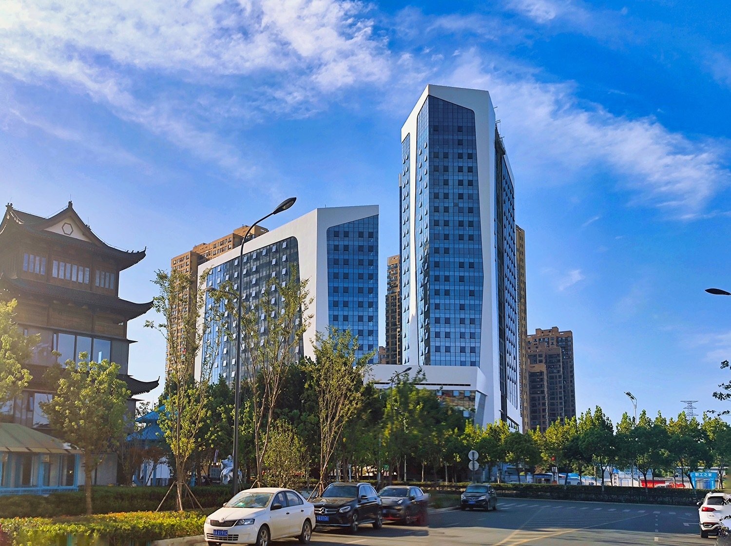 It is a project developed by Recs Italia for two towers in Hefei, a metropolis of four and a half million inhabitants in the province of Anhui. The tallest tower will house a 5-star hotel, the other will have offices, and the base part will host a mall and some areas of the hotel. For this project, numerous versions of the façade have been created, maintaining the layout unaltered. The final choice of the customer fell on the proposal that we considered the best for simplicity and clarity of composition. The façade design is based on the delimitation of the volume that takes place thanks to the treatment of the corners that interrupt the continuous façade, without reducing the glazed surface available, as well as the basement and the attic floor. This perimeter with non-orthogonal lines characterizes the plasticity of the elevations, also thanks to the light colour and GRC texture.