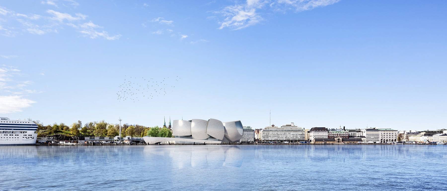 O homem e seu bem-estar são o foco. Foi este pensamento que nós utilizamos quando concebemos o novo Guggenheim para a Helsinki do futuro. A organização espacial do museu estabelece uma relação estreita com o patamar da cota 0.00, a forma da elevação e a suavidade das superfícies buscam, no entanto, um elo com a tradição finlandesa, mas, ao mesmo tempo, perseguem convergências com os demais edifícios icônicos do mundo, transpondo as fronteiras da cidade e do país. O saguão que antecede o coração do museu caracteriza-se por um volume triplo sobre o qual desembocam os principais ambientes: a galeria leste, o foyer das salas, o corredor externo, as salas expositivas. A praça-saguão, que se apresenta como welcome center para os turistas e ponto de cultura e lazer para os cidadãos de Helsinki durante o ano, caracteriza-se pela cobertura transparente com uma estrutura de madeira que, por analogia, representa a “floresta”, elemento primordial no imaginário coletivo finlandês. O edifício é composto por corpos distintos: a praça, as salas expositivas, os saguões, o jardim, as rampas, os “involucros”, cada um com uma função definida. O conjunto resulta numa forma icônica que pode elevar-se a símbolo da cidade. Funcionalmente, o edifício inteiro é dividido em duas partes, que podem subsistir separadamente: uma é a área do museu (monitorada pela segurança) com as salas expositivas, a outra é a área pública, de livre acesso, onde se encontram a cafeteria e o restaurante. A sala de conferências e a sala multifuncional podem ter acesso livre ou não, o que permite uma total flexibilidade. A parte mais ao sul é aproveitada com a colocação de um jardim, lugar que pode ser desfrutado para exposições ao ar livre. Parte da zona que está em terra firme, de frente ao mar, é destinada a hospedar mostras dedicadas a jovens artistas e designers finlandeses. A praça também pode ser utilizada como espaço expositivo cenográfico, podendo utilizar-se da sua altura total.