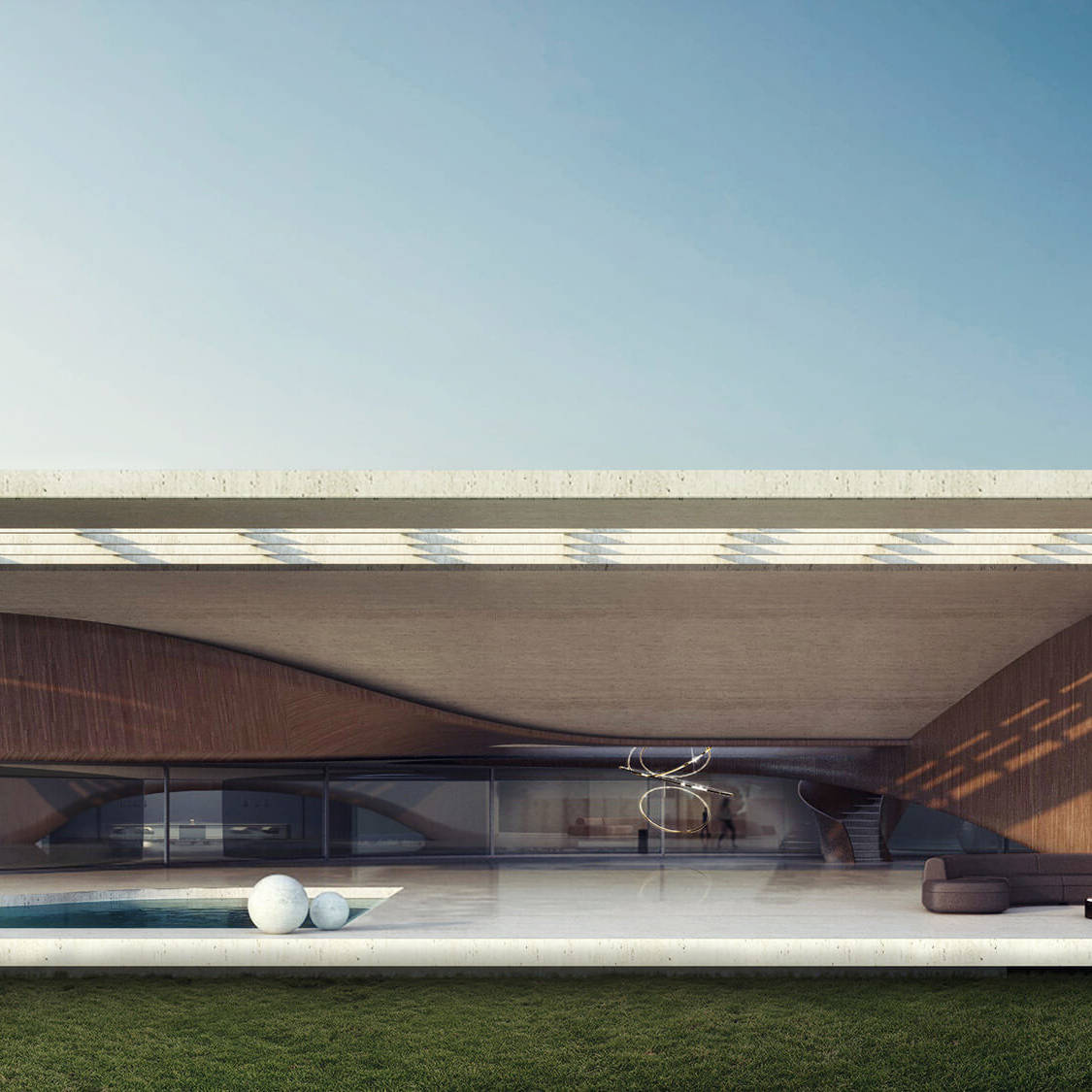 O projeto consiste na sobreposição de duas formas retangulares simples de proporção alongada, remetendo à paisagem horizontal.